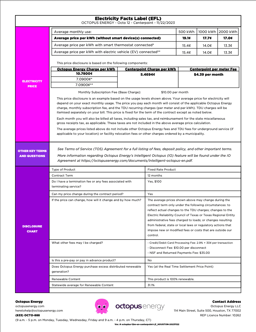 An EFL, or Electricity Facts Label, is a document that provides important details about your electricity contract. It covers things like the terms of the agreement, pricing, and how to get in touch with the provider. In Texas, the Public Utility Council (PUCT) requires all retail energy providers to have one.